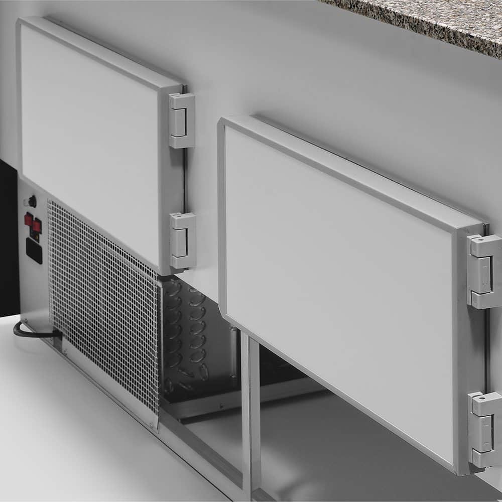 Disken er ikke kun flot at se på; den er bygget til arbejde. Arbejdsbordet og udstillingsfladen er udført i AISI 304 rustfrit stål, hvilket er hygiejnisk og nemt at rengøre. Det indbyggede LED-lys præsenterer varerne optimalt uden at afgive varme. En af de største fordele ved denne model er den kølede reserve i bunden (tilgængelig fra bagsiden), som giver dig mulighed for hurtigt at genopfylde disken uden at skulle løbe ud på lageret.